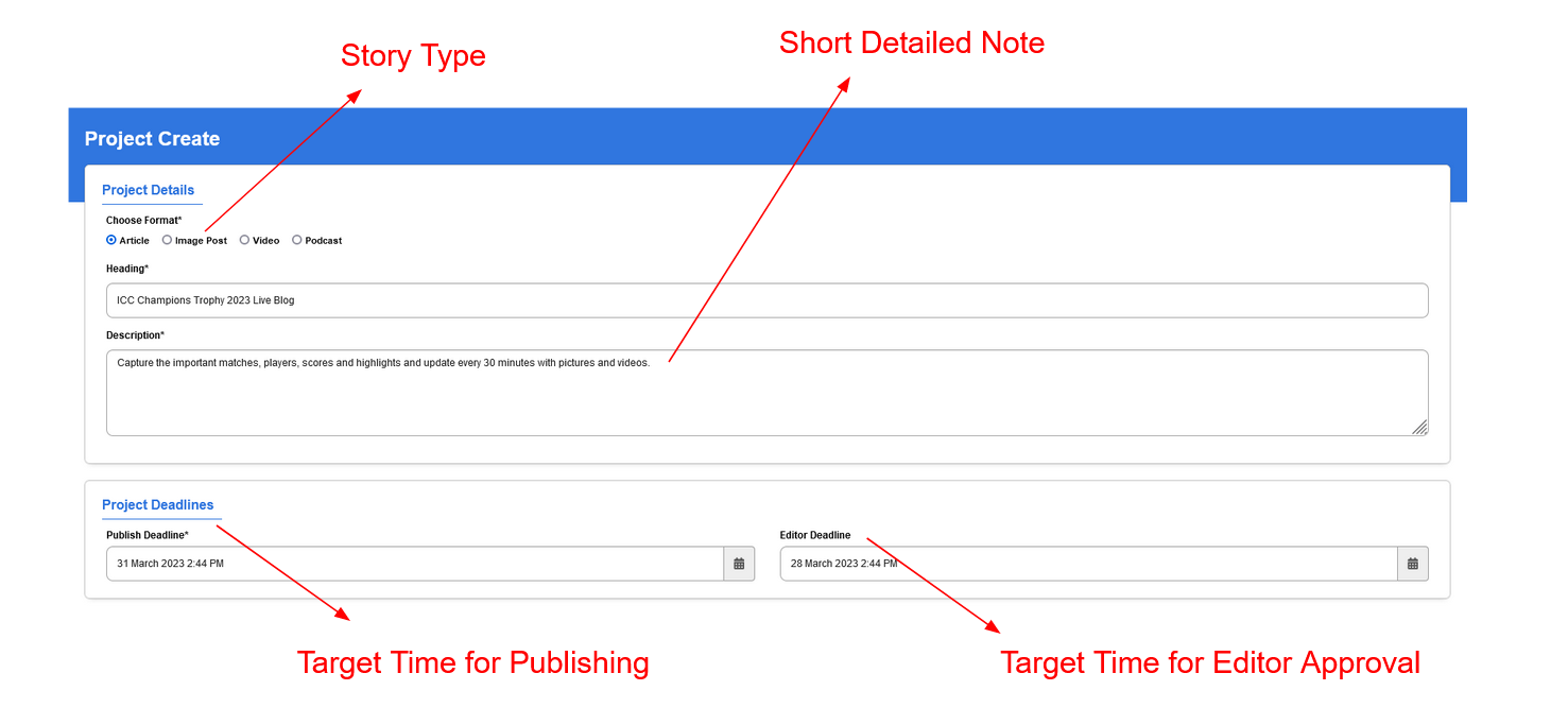 Publish Deadline - This is the Due Date by which the story has to be published and go Live. This also marks the End Date of the Project.