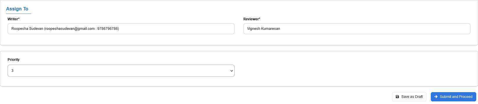 Once the details have been filled you can choose to save the Project in draft to be assigned later or you can immediately assign the Project to the writer using the Submit & Proceed Button