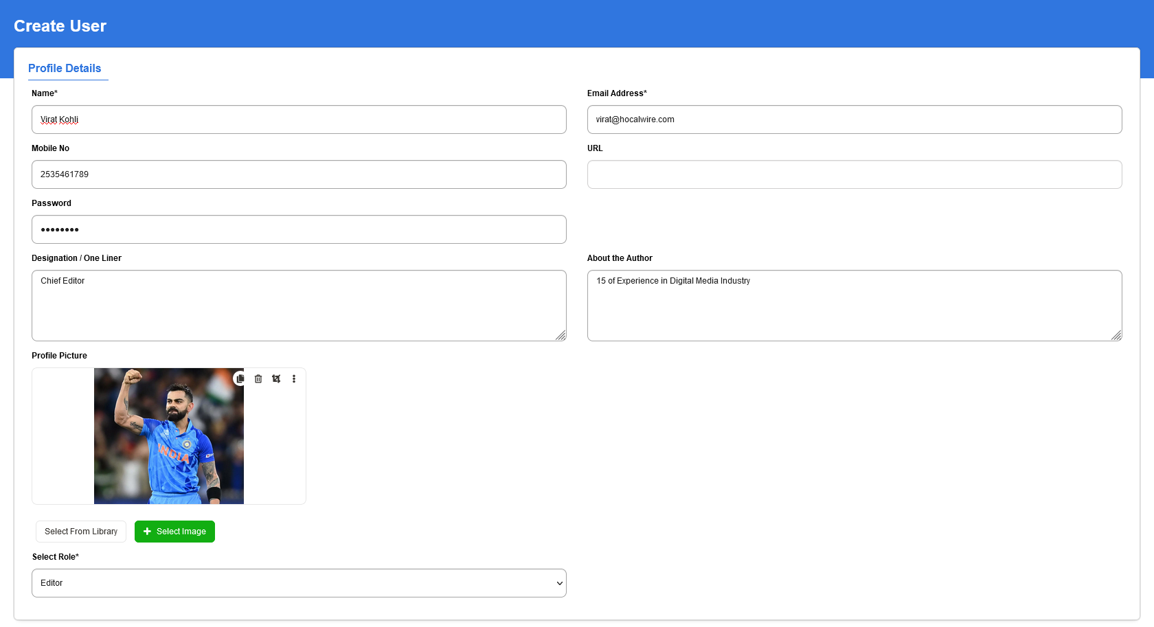 The Create User section lets you add news Users on to the CMS in various roles and assign them to user groups. This is a simple form for which details needs to be entered and the Password can be shared and changed later.