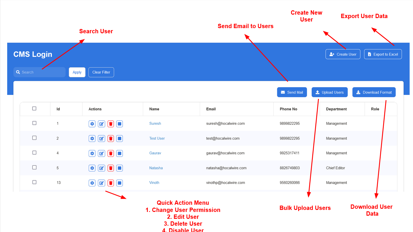 This module has various actions that manages the users who can login to the CMS and perform operations. As listed below:
