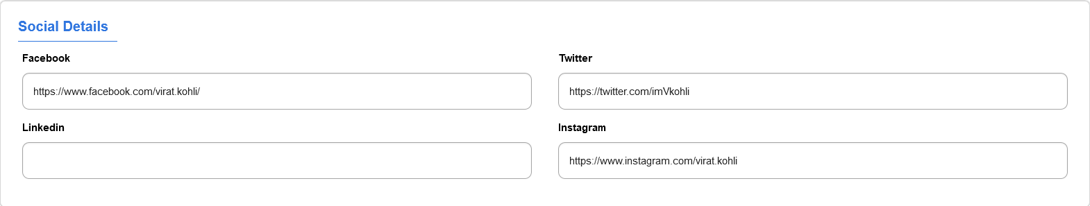 After the profile details section we need to add the Social Profile of the User in the CMS. This is not mandatory but helps in efficient operation of the Newsroom. We have configured Facebook, Instagram, Twitter, LinkedIn. After filling out the Social Details page select Save.