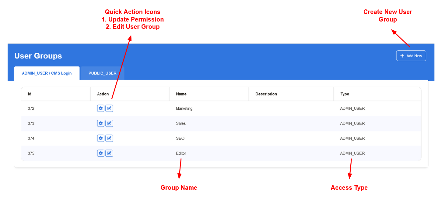 This is the section where we create granular level permissions to the User Group Members. Primarily this has access control to Create, Edit, Delete, Allow, Enable & Disable features within the CMS. You can find the detailed documentation on Assign Permissions in the page. For now we have listed the allowed access controls for reference.