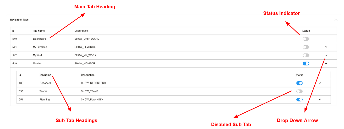 Hocalwire CMS allows you to hide the Tabs in the Top Level and also control which Sub-Tabs in the Main Tab needs to be shown. This can be done using the Small Drop down arrow to show the Sub-Tabs within the Main Tab Layout