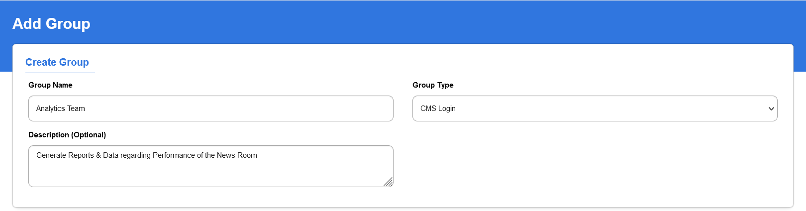 The description is an optional field where you can add text that define the access level and identification of the group.