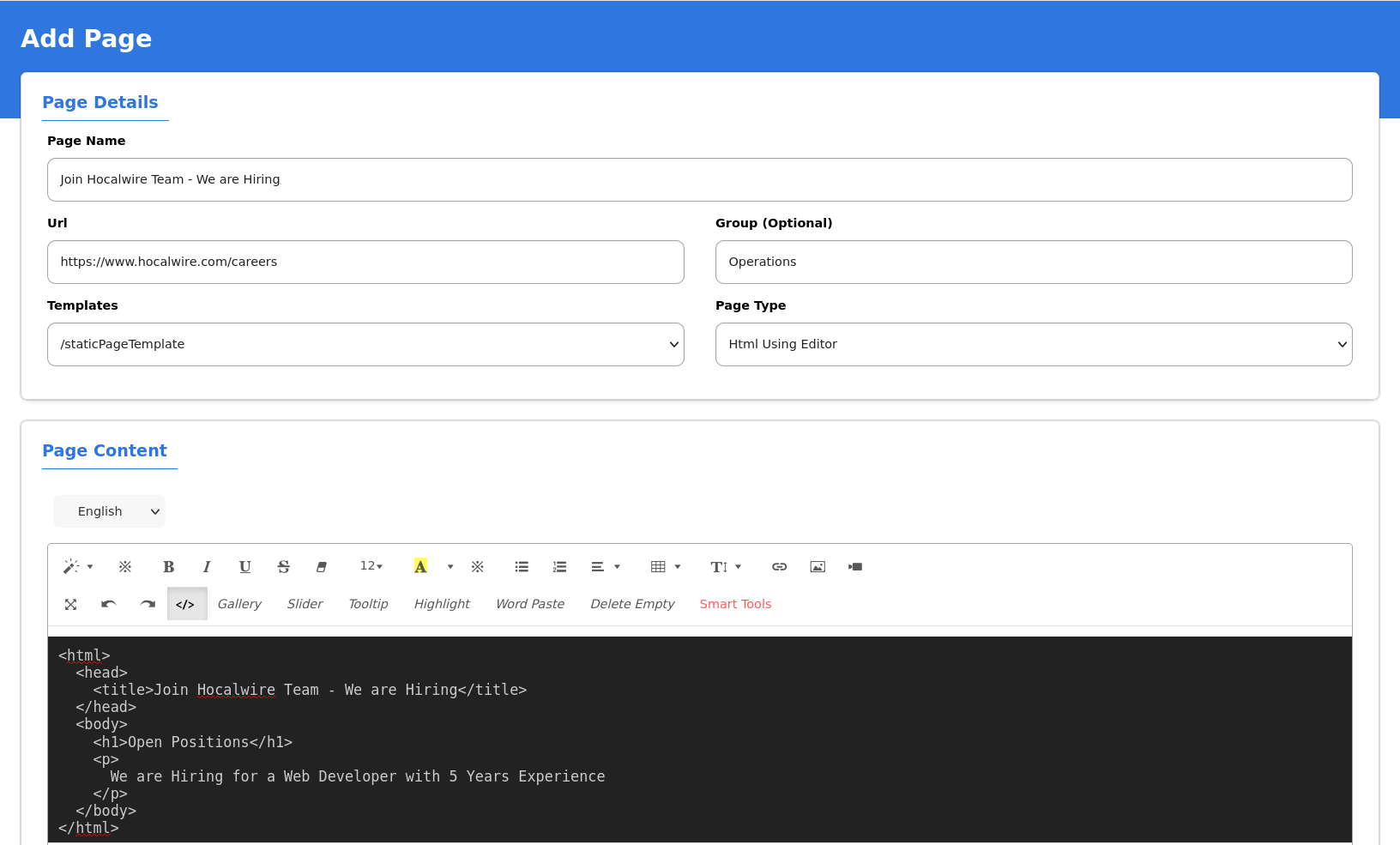 Hocalwire CMS lets you create Static Pages directly from the CMS Application without needing to code and push them separately. This becomes handy when ever we want to build quick pages.