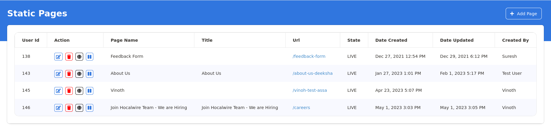 The landing page lets you look at the Static Pages that are live and their current status. It also shows some extra data such as Date created and Updated along with a Change Log in the Edit Page.