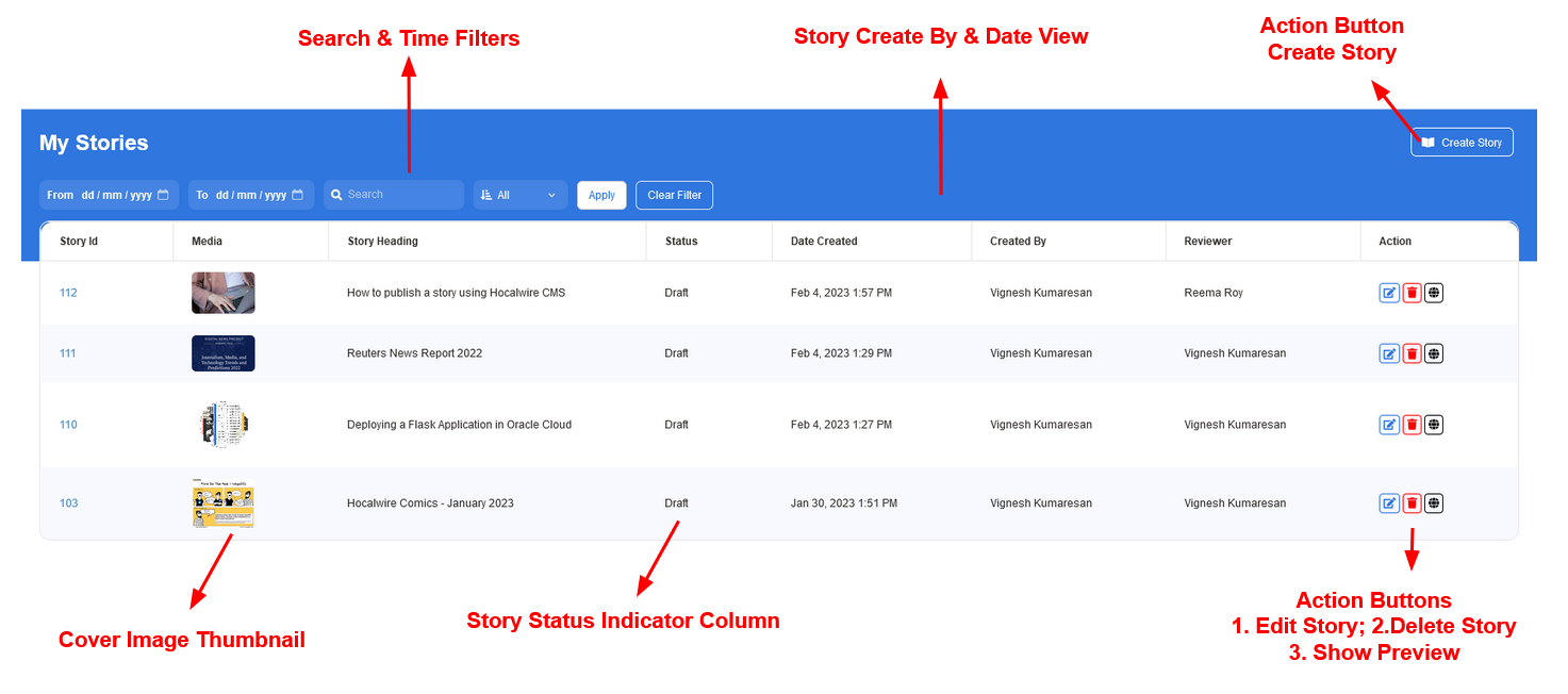 The Primary Action of the My Stories page is to Create a Story & View Drafts. Apart from that it lets you filter and search news articles based on time. It gives some more details including Time of Creation, Author, Reviewer and also lets you Edit, Delete & Preview the story.