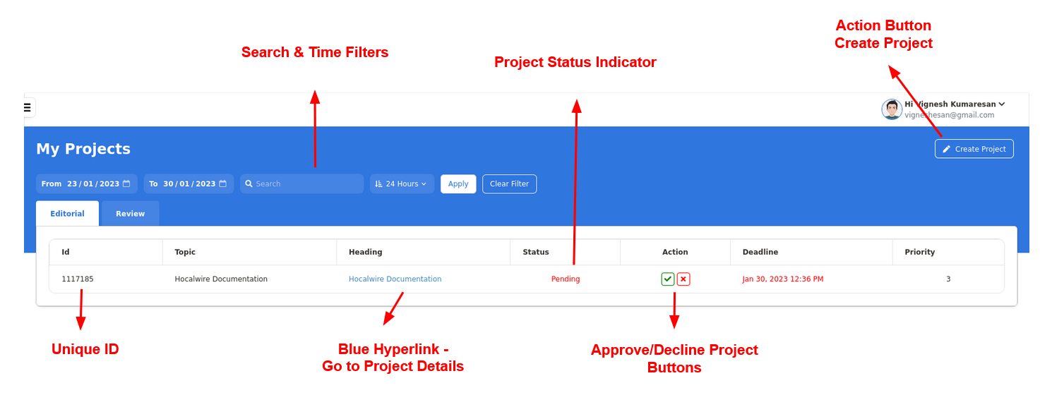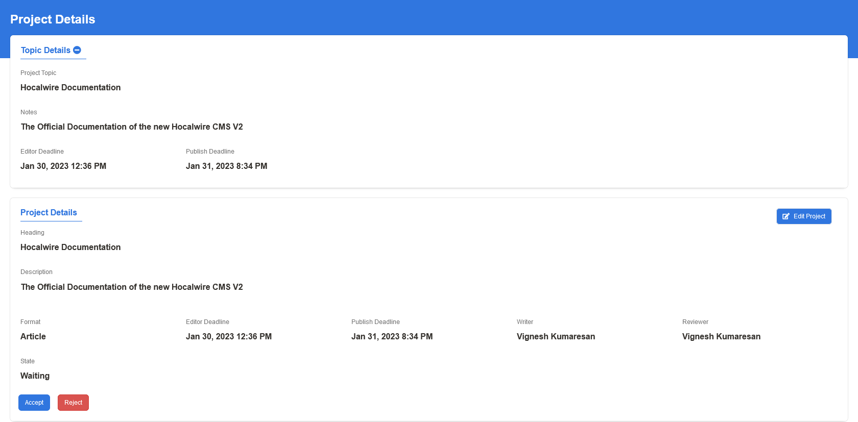 This view in here shows the assigned project of Hocalwire Documentation to the writer. The current status is Pending because the writer has not accepted the task yet. The importance of this project has been assigned by the editor as 3 to denote Priority.